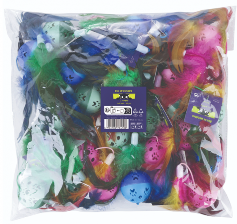 Пакет включает 30 мячиков диаметром 5 см, украшенных перьями и оснащённых звенящим бубенчиком внутри. Эти игрушки привлекают внимание кошек и стимулируют их природные инстинкты, превращая каждый день в праздник активности и веселья. Основные характеристики: Упаковка: 30 штук; Цвета игрушек: розовый, синий, зелёный; Материалы: перья, пластик; Пакет игрушек станет отличным выбором для заполнения бокса УТ-068192, который прекрасно подходит для установки в прикассовой зоне. Набор "Box of Wonders" создан для удовлетворения игровых потребностей кошки, предлагая разнообразие ярких и качественных игрушек, которые подарят ей часы увлекательных игр. Подробнее