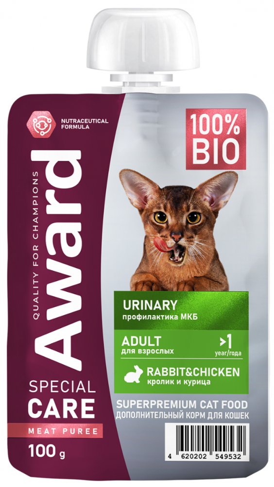 Мясное пюре SPECIAL CARE Urinary - это дополнительное питание, которое идеально подойдет для профилактики мочекаменной болезни у взрослых кошек. Обладает нежнейшей текстурой, сбалансированным составом и высокой вкусовой привлекательностью. Рацион на основе свежего мяса куриной грудки с кроликом содержит незаменимые аминокислоты, которые способствуют поддержанию мышечной массы питомца в оптимальном состоянии и обеспечивают запас энергии. Содержит клюкву и жимолость, которые обладают противовоспалительным действием и способствуют профилактике инфекций мочевыделительной системы. Витаминно-минеральный комплекс для поддержания здоровья и крепкого иммунитета. Добавлен таурин для здоровья сердца и остроты зрения. Мясное пюре отлично подходит для сочетанного питания вашей кошки. Подробнее