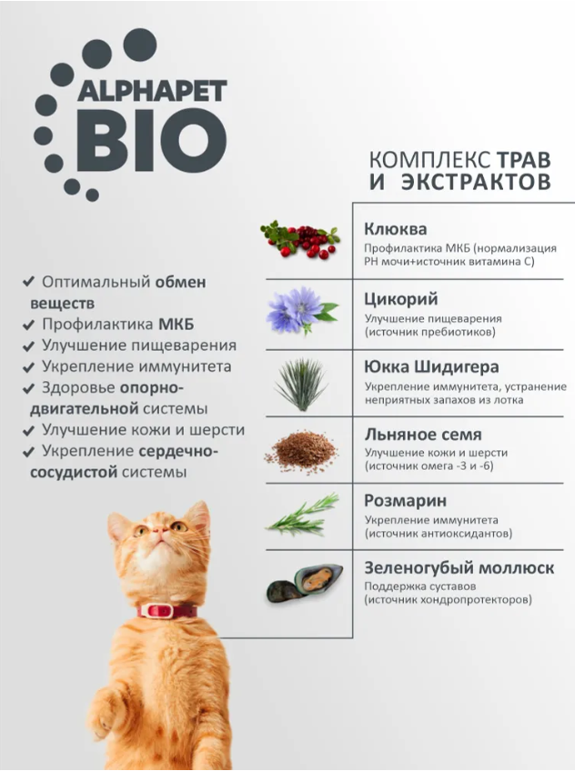 мясные ингредиенты 43,5%, в том числе свежее мясо 10% (говядина, свиные печень и сердце), дегидрированное мясо домашней птицы 31%, пшеница, рис 15%, животный жир, гидролизованная куриная печень, сушеная мякоть сахарной свеклы, желтый горошек, витаминно-минеральная смесь, пивные дрожжи, рыбий жир, комплекс AlphaPetBIO® (зеленогубый моллюск, календула, одуванчик, льняное семя, цикорий, клюква, Юкка Шидигера, розмарин), таурин, DL-метионин, антиоксидант.