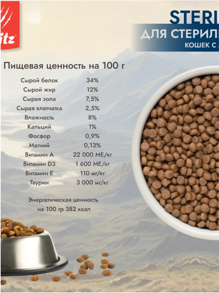 "Сухой корм супер-премиум класса для стерилизованных кошек с лососем — это идеальное сочетание великолепного вкуса и сбалансированного питания. Оптимальное содержание клетчатки и L-карнитин препятствует набору лишнего веса. Лосось, содержащий Омега-3 жирные кислоты, способствует поддержанию здоровой шерсти у питомца и сохранению крепкого сердца. Входящий в состав DL-метионин способствует поддержанию оптимального РН. А включенный в формулу корень цикория – природный источник инулина, выполняет роль пребиотика для улучшения пищеварения и усвоения питательных веществ из пищи. Содержащиеся в корме морские водоросли – ценный источник минералов, благодаря антиоксидантным свойствам которого укрепляется иммунная система. Корм включает качественные низкоаллергенные зерновые культуры: рис и кукурузу. Не содержит пшеницу, зачастую являющуюся причиной аллергии. Обогащение корма клюквой и контролируемый уровень минералов обеспечивают здоровье мочеполовой системы." Подробнее