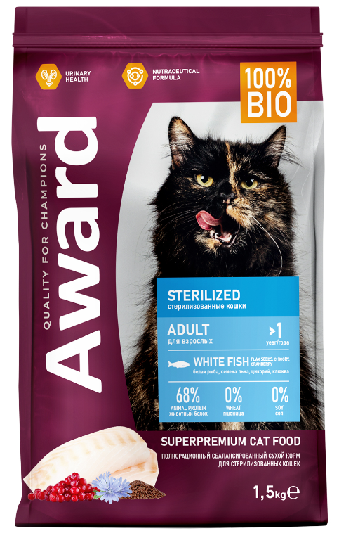 Сухой корм AWARD Sterilized для взрослых стерилизованных кошек с белой рыбой с добавлением семян льна, клюквы и цикория