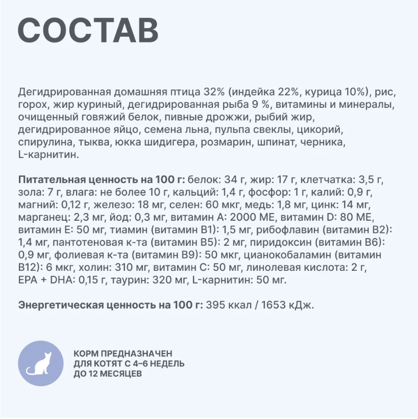Улучшенная формула: еще больше животного белка и полезных ингредиентов! Для растущего организма котят мы разработали полнорационную формулу с повышенным содержанием белка, чтобы обеспечить любознательным малышам необходимую энергию. А омега-3, таурин, тиамин, пребиотики и целый комплекс витаминов и минералов поддерживают правильное развитие мозга, иммунной и других систем растущего организма. Преимущества: Повышенное содержание высококачественного животного белка в составе — 83%. Этот показатель рассчитан ветеринарными диетологами и позволяет обеспечить растущий организм котенка необходимыми аминокислотами без избыточной нагрузки на почки. Натуральная диетическая клетчатка (из семян льна, тыквы и шпината) не раздражает желудочно-кишечный тракт и мягко поддерживает его функцию. Таурин и тиамин (витамин B1) для правильного развития нервной системы, иммунитета, метаболизма, а также поддержания зрения и сердца. Повышенное содержание омега-3 (рыбий жир) для правильного развития мозга, слуха и зрения. Пребиотики для правильного формирования микрофлоры кишечника и иммунной системы. Антиоксиданты для подавления окислительных процессов, которые сопутствуют активному росту котенка. Баланс витаминов и минералов для поддержания нормального функционирования всех систем организма. Отсутствие в составе синтетических консервантов, ароматизаторов, усилителей вкуса и ГМО. Соответствие нормам по кормам FEDIAF, NRC и российскому ГОСТу Р 55453-2022. Состав Дегидрированная домашняя птица 32 % (индейка 22 %, курица 10 %), рис, горох, жир куриный, дегидрированная рыба 9 %, витамины и минералы, очищенный говяжий белок, пивные дрожжи, рыбий жир, дегидрированное яйцо, семена льна, пульпа свеклы, цикорий, спирулина, тыква, юкка шидигера, розмарин, шпинат, черника, L-карнитин. Подробнее