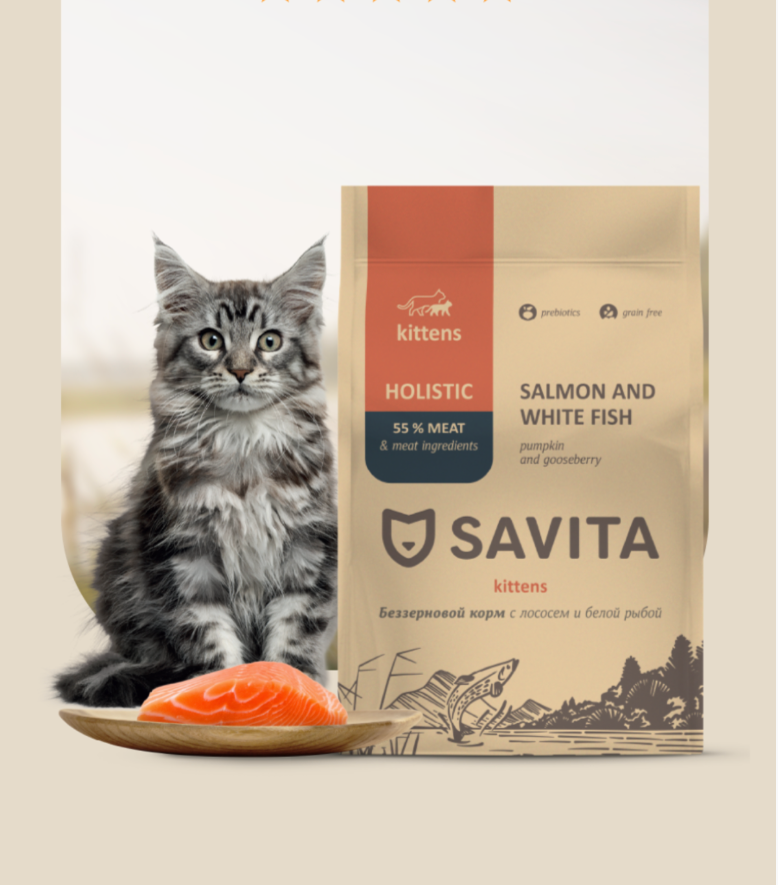 Savita - с уважением к дикой природе Вашего питомца. Польза природных ингредиентов и многолетний опыт, объединённые с эффективностью современных технологий. Полнорационные и сбалансированные корма Savita класса холистик содержат высокий процент мясных ингредиентов, необходимых витаминов и минералов, без добавления зерновых культур в составе. Надолго обеспечивают котенка необходимой энергией для правильного роста и развития. Каждый ингредиент тщательно подобран в соответствии с природными потребностями питомца и является важным компонентом в рецептуре корма, минимизируя риск возникновения аллергических реакций. Преимущества корма: беззерновая формула; высокий процент мяса и мясных ингредиентов; корма изготовлены из натурального сырья по стандарту качества human grade, не содержат ГМО, сои, ароматизаторов, искусственных консервантов и красителей; составы сухих кормов включают пребиотики, необходимые для здорового пищеварения питомца; овощи, фрукты, ягоды и травы в составах являются источниками антиоксидантов, витаминов и минералов. Размер гранул: 4,5-5мм Состав: рыба (в т.ч. треска 30 %, лосось 8 %), картофель, зелёный горошек, куриный жир, витаминно-минеральный комплекс, пивные дрожжи,цельное яйцо, пульпа сахарной свёклы, льняное семя, тыква, морковь, яблоко, лососёвый жир, облепиха, крыжовник, розмарин, цикорий, таурин, глюкозамин из животных тканей, сульфат хондроитина, юкка Шидигера. Аналитический состав: сырой белок 35%, сырой жир 18%, сырая клетчатка 2,5%, сырая зола 8%, кальций 1,5%, фосфор 1,1%, натрий 0,4%, калий 0,6% Калорийность 422 кКал Питательные добавки на 1 кг: витамин A 20 000 МЕ, витамин D3 1 600 МЕ, витамин E 400 мг, витамины группы В 2900 мг, витамин C 100 мг, таурин 16000 мг, медь (сульфат меди пентагидрат) 15 мг, цинк (сульфат цинка моногидрат) 140 мг, марганец (сульфат марганца моногидрат) 30 мг, йод (йодат кальция) 2 мг, селен (селенит натрия) 0,4 мг Технологические добавки: антиоксидант. Подробнее