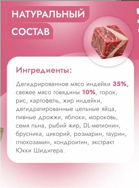 Дегидрированное мясо индейки (35%), свежее мясо говядины 10%, горох, рис, картофель, жир индейки, дегидратированные цельные яйца, пивные дрожжи, яблоки, мороковь, семя льна, рыбий жир, DL-метионин, брусника, цикорий, розмарин, таурин, глюкозамин, хондроитин, экстракт Юкки Шидигера.