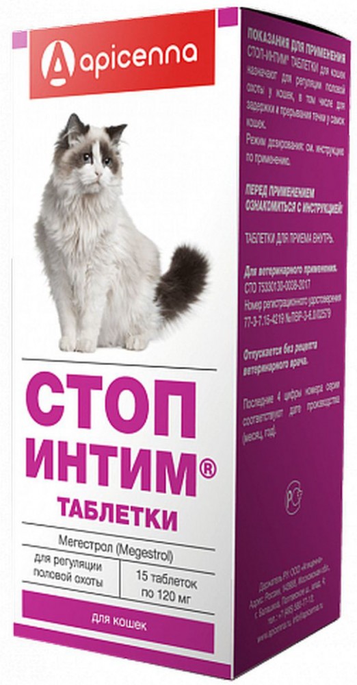 • Современная формула стоп-интим таблеток оказывает мягкое контрацепивное действие на организм животного. • У самок препарат решает проблемы: – нежелательной беременности, – задержки и прерывания течки, – коррекции нежелательного сексуального поведения и др. • Незаменим при: – выезде на дачу, – участии в выставках, – длительном отсутствии хозяина и др. Стоп-Интим таблетки — препарат для регуляции половой охоты у собак и кошек. Стоп-Интим таблетки для кошек назначают для регуляции половой охоты у кошек, в том числе для задержки и прерывания течки у самок кошек, снижения половой активности и коррекции поведения у котов. Противопоказанием к применению Стоп-Интим таблеток для кошек является повышенная индивидуальная чувствительность животного к компонентам препарата (в том числе в анамнезе), заболевания мочеполовой системы, опухоли и диабет. Стоп-Интим таблетки для кошек вводят перорально, принудительно на корень языка, за 1 — 2 часа до кормления, с учетом показаний и пола животного. С целью задержки течки кошкам препарат применяют в период между течками один раз в неделю в дозе 1/2 таблетки или один раз в две недели в дозе 1 таблетка (5 мг по ДВ), но не более 18 месяцев подряд. Повторение курса возможно после проявления у кошки нормального физиологического цикла. С целью прерывания течки кошкам препарат применяют при появлении ее первых признаков (но не позже чем через 3 дня от ее начала) в дозе 1 таблетка (5 мг по ДВ) на животное в день 5 — 7 раз с интервалом 24 часа (до исчезновения признаков течки плюс один день). Котам для снижения полового возбуждения и коррекции поведения препарат применяют в дозе 1 таблетка (5 мг по ДВ) на животное. Первые 7 дней лекарственное средство дают ежедневно в суточной дозе, последующие 14 дней — 1/2 суточной дозы. Подробнее