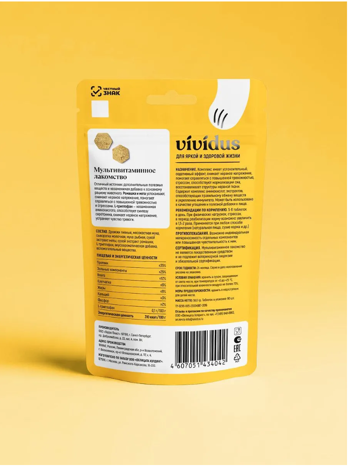 Мультивитаминное лакомство - отличный источник дополнительных полезных веществ и незаменимая добавка к основному рациону животного. Ромашка и мята успокаивают, снимают нервное напряжение, помогают справляться с повышенной тревожностью и стрессами. L — триптофан —незаменимая аминокислота, способствует синтезу серотонина, снимает нервное напряжение, устраняет чувство тревоги. Это лакомство представляет собой специализированное мультивитаминное лакомство для кошек, созданное для поддержания эмоционального баланса и снижения стресса. Это инновационный продукт, обогащённый натуральными успокаивающими компонентами: L-триптофаном, экстрактами ромашки и мяты. Лакомство служит полезной добавкой к основному рациону, способствуя гармоничному состоянию и улучшению качества жизни питомца. Антистрессовый комплекс L-триптофан — незаменимая аминокислота, способствующая естественному синтезу «гормона счастья» серотонина. Это помогает снизить нервное напряжение и чувство тревоги у кошки. Натуральные экстракты ромашки и мяты обладают мягким седативным эффектом, успокаивают нервную систему и помогают питомцу легче Комплексная поддержка здоровья Помимо успокаивающего эффекта, продукт способствует нормализации сна, восстановлению нервной ткани, правильному обмену веществ и укреплению иммунитета благодаря комплексу аминокислот и экстрактов в составе. Удобство и универсальность Таблетки-лакомство можно давать при любом типе кормления (натуральная пища, сухой или влажный корм). Рекомендуемая норма — всего 5−6 таблеток в день, что делает применение простым и экономичным. В периоды повышенных нагрузок, стресса или реабилитации дозу можно гибко увеличивать (до 15−20 таблеток в день). Формат полезного лакомства Таблетки выполняют не только функцию витаминно-успокаивающей добавки, но и служат вкусным поощрением, что упрощает процесс скармливания и положительно влияет на взаимодействие с питомцем. Идеально подходит для: кошек, подверженных стрессу из-за переездов, визитов к ветеринару, появления новых животных или людей в доме, одиночества, а также в периоды реабилитации и повышенных физических нагрузок. С заботой Vividus заботится о здоровье и счастье ваших любимцев. Наши лакомства — это идеальный способ показать свою любовь и заботу о кошке. Подробнее