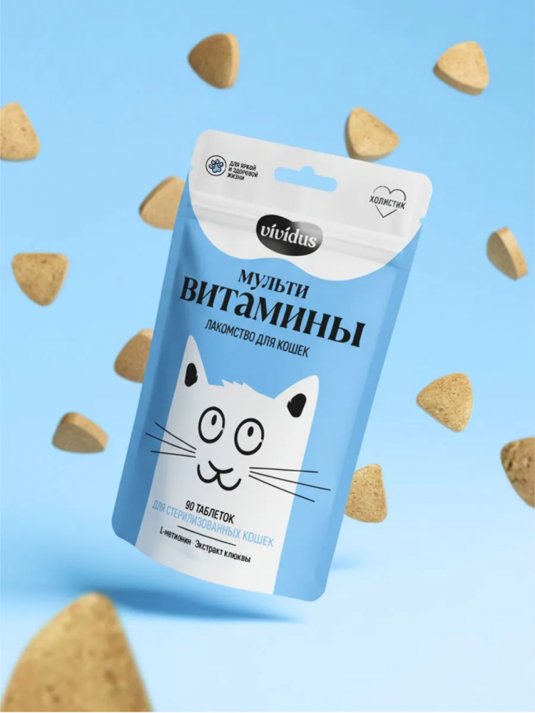 Здоровые кошки Мультивитаминное лакомство – отличный источник дополнительных полезных веществ и незаменимая добавка к основному рациону животного. Метионин способствует нормальной работе мочеполовой системы, клюква поддерживает кислую среду мочи и предотвращает образование камней. Специально разработано для поддержания здоровья и хорошего настроения вашей кошки после стерилизации. Содержит ключевые компоненты для профилактики распространённых проблем мочеполовой системы и укрепления иммунитета. VIVIDUS Мультивитамины — это не просто лакомство, а функциональная добавка, которая помогает сохранить здоровье мочевыводящих путей, укрепить иммунитет и подарить питомцу дополнительную порцию заботы и радости. Идеально для стерилизованных кошек, нуждающихся в особом внимании к мочеполовой системе и общему тонусу. Специализированная формула Специализированная формула для стерилизованных кошек Содержит L-метионин и экстракт клюквы, которые: Поддерживают нормальную работу мочеполовой системы. Способствуют сохранению кислой среды мочи, что помогает предотвращать образование камней. Витаминная поддержка Включает витамин, А для здоровья мышц, кожи и иммунитета, а также комплекс других витаминов группы B, C, D3, E и других важных микронутриентов. Удобство применения Рекомендуется 5−6 таблеток в день. Норма может быть увеличена в 1,5−2 раза в периоды нагрузок, стрессов или реабилитации. Подходит при любом типе кормления: натуральном, сухим кормом и др. Таблетки воспринимаются кошкой как лакомство, что упрощает приём добавки. 90 таблеток —Достаточный объём упаковки для курсового применения. Честный и понятный состав Основные ингредиенты: Пивные дрожжи, мясокостная мука, молочная сыворотка, сухое обезжиренное молоко, рыбная мука, витаминный комплекс. С заботой Vividus заботится о здоровье и счастье ваших любимцев. Наши лакомства — это идеальный способ показать свою любовь и заботу о кошке. Подробнее
