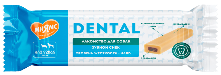 Мнямс DENTAL "Зубной снек"с говядиной – вкусное и полезное лакомство для взрослых собак крупных пород и щенков крупных пород старше 3-х месяцев. Обладает высокой вкусовой привлекательностью и прекрасной поедаемостью. Благодаря особой форме гарантирует тщательное очищение даже самых труднодоступных мест полости рта, предотвращает появление налета и обеспечивает профилактику появления зубного камня, обладает антибактериальным и освежающим действием, деликатно массирует десны. Состав в 100 г: белки 9 %, жиры 2,0 %, клетчатка 3 %, зола 2,5 %, влага 20 %. Энергетическая ценность на 100 г: 306 ккал. Ингредиенты рис, мясо и субпродукты (в т.ч. говядина 4%), белок растительный, клетчатка, лецитин, масла и животные жиры, дрожжевой экстракт, минеральные вещества, натуральный ароматизатор, натуральный краситель. Подробнее