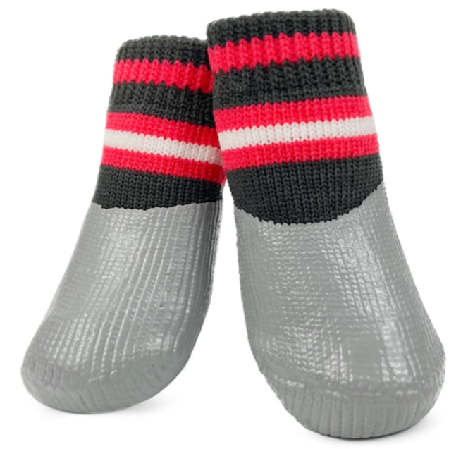 Комплект носков для собак "Полоски" состоит из четырех изделий, выполненных преимущественно из хлопка с водостойким нитриловым покрытием на подошве. Нитриловое покрытие изготавливают из искусственно синтезированного каучука, пришедшего на смену натуральному латексу. Нитрил не вызывает аллергии, более прочный и износостойкий. Используя такие носочки на улице, Вы защитите лапы собаки от снега, слякоти, реагентов и порезов. В домашних условиях такие носочки ограждают интерьер от когтей любимца и, благодаря противоскользящему покрытию, позволяют четвероногому питомцу с комфортом передвигаться по паркету, кафелю и другим скользким покрытиям. Носочки легко одевать, а благодаря эластичным резинкам они не слезают с лап животного. Изделия просты в уходе и избавят вас от регулярного мытья лап собаке после прогулки. Цвет: серо-черный с красным. Размеры изделия: 35*90мм. Подробнее