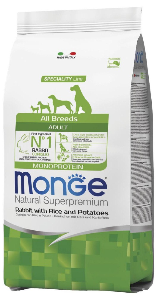 MONGE SPECIALITY LINE ALL BREEDS ADULT RABBIT, RICE & POTATOES - это полноценный сбалансированный рацион для взрослых собак всех пород с особыми потребностями. В состав входят отборные гипоаллергенные источники белка животного происхождения, что позволяет легко исключить из рациона ингредиенты, вызывающие аллергию.
