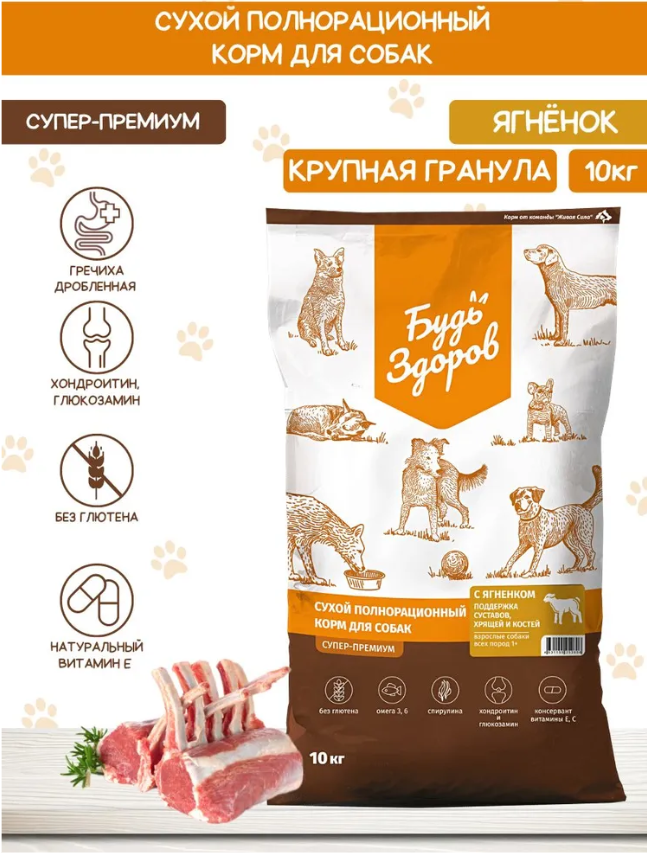 Корм Будь Здоров (Живая сила) Супер-Премиум (крупная гранула) для собак, поддержка суставов, хрящей и костей, повышенное содержание глюкозамина и хондроитина, с ягнёнком, 10 кг