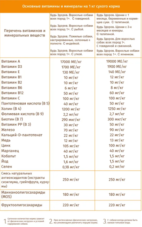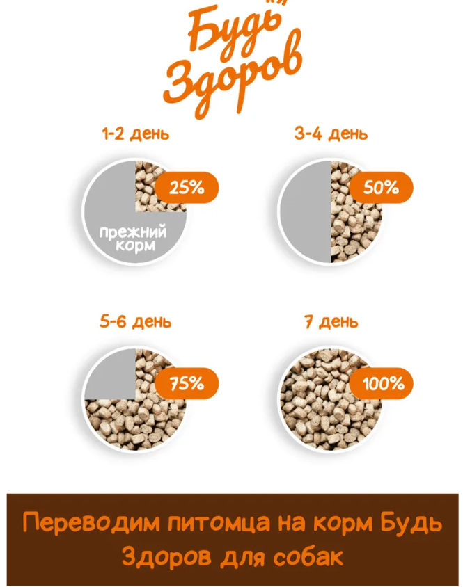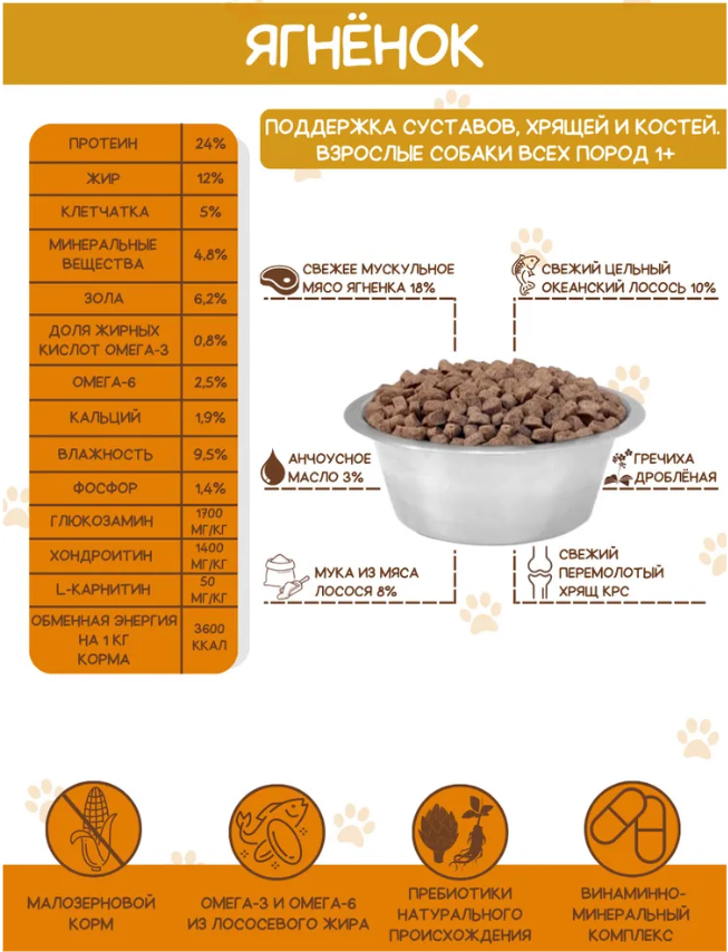 Корм Будь Здоров (Живая сила) Супер-Премиум (крупная гранула) для собак, поддержка суставов, хрящей и костей, повышенное содержание глюкозамина и хондроитина, с ягнёнком, 10 кг Будь Здоров с ягненком, крупная гранула. Корм для взрослых собак, поддержка суставов. Будь Здоров с ягненком – это корм для настоящих гурманов. Ягненок отлично подходит для пищеварения собак, легко усваивается и богат аминокислотами. Отличительная особенность этого корма – уменьшенное количество зерновых за счет наличия гречихи дробленной (не является зерном). Усиленное количество свежего перемолотого хряща КРС и наличие муки из рогов северного оленя являются источниками необходимых элементов для поддержания хрящевой ткани и костей в оптимальном состоянии. Внимание! Повышенное содержание глюкозамина и хондроитина (перемолотый хрящ КРС и мука из рогов северного оленя) может вызвать индивидуальную реакцию ЖКТ. Мясные ингредиенты высокого качества 36 % (свежее мускульное мясо ягненка 18 %, свежий цельный океанский лосось 10 %, мука из мяса лосося 8 %) Увеличенная доля глюкозамина и хондроитина (свежий перемолотый хрящ КРС) Малозерновой корм – основа углеводов гречиха дробленная Все необходимые витамины и минералы (включая жирные кислоты Омега 3,6 Смесь экстрактов куркумы, грейпфрута, сизигиума (природные источники натурального витамина E Пищевая ценность: протеин 24 %, жир 12 %, клетчатка 5 %, влажность 9,5 %, минеральные вещества 4,8 %, зола 6,2 %, доля жирных кислот омега-3 0,8 %, омега-6 2,5 %, кальций 1,9 %, фосфор 1,4 %, глюкозамин 1700 мг/кг, хондроитин 1400 мг/кг, L–карнитин 50 мг/кг, обменная энергия на 1 кг корма – 3600 ккал. Состав: дегидрированный ягненок 28 %, свежее мясо ягненка 20 %, гречиха дробленная (не является зерном), дегидрированный лосось 10 %, свежий цельный атлантический лосось 8 %, перемолотый хрящ КРС, гемоглобин, свежие кабачки, сушеные яблоки, цельный рис, масло подсолнуха холодного отжима, семя льна, экстракт Юкка Шидигера, спирулина, пивные дрожжи, лососевый жир (естественный источник Омега-3 и Омега-6), пребиотики натурального происхождения – свежий топинамбур и экстракт корня цикория (источники МОС и ФОС), Мико Карб, смесь экстрактов куркумы, грейпфрута, сизигиума (природные источники натурального витамина E), витаминно-минеральный комплекс. Подробнее