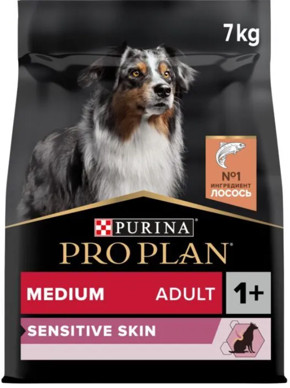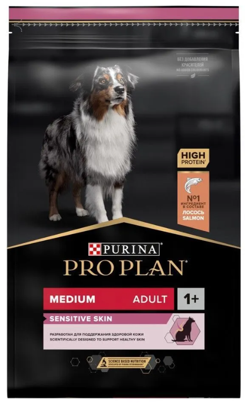 Корм сухой полнорационный для взрослых собак средних пород с чувствительной кожей Purina® PRO PLAN® Medium Adult Sensitive Skin с комплексом OPTIDERMA®, с лососем и рисом.