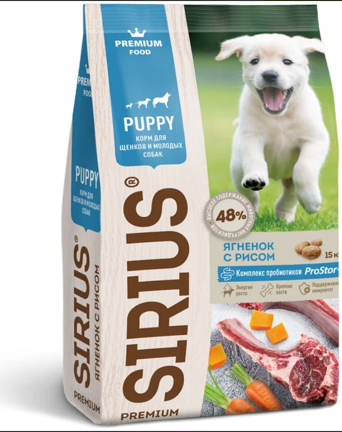 SIRIUS — сухой корм премиум класса для полноценного ежедневного рациона щенков и молодых собак. Высокое содержание мясных ингредиентов обеспечивает оптимальный уровень белка и укрепляет мышцы. Баланс витаминов и комплекса пробиотиков 4-го поколения PROSTOR+ нормализует пищеварение и укрепляет иммунитет. Омега 3 и Омега 6 способствуют поддержанию здоровья сердца, мозга, нервной системы, здоровья кожи и красоты шерсти. Дегидрированное мясо (курицы 28%, ягнёнка 8%), рис, кукуруза, пшеница, жир куриный, растительные волокна (источник клетчатки), гидролизованные мясные белки, дрожжи пивные сухие, жир лососевый 0.8%, морковь сушеная, тыква сушеная, пробиотический комплекс ProStor+ (Bacillus subtillis, Bacillus licheniformis, автолизат пивных дрожжей, пектиновый комплекс, эхинацея, ромашка), сельдерей сушеный, Юкка Шидигера. Корм не содержит искусственных красителей, ароматизаторов, ГМИ. Добавка на 1 кг: Витамин А – 18 000 МЕ, витамин Д3 – 1200 МЕ, витамин Е – 300 МЕ, витамины группы В (В1, В2, В3, В4, В5, В6, В9, В12) – 1448 мг, биотин – 2мг, железо – 130 мг, цинк – 140 мг, марганец – 19 мг, медь – 13 мг, йод – 2.6 мг, селен – 0,2 мг. Показатели питательной ценности: Сырой протеин – 28%, сырой жир – 15%, сырая клетчатка – 3,0%, сырая зола – 8%, влажность – 9%, кальций – 1.5%, фосфор – 1,1%. Сумма омега 6 и 3 жирных кислот – 3,2%. Энергетическая ценность – 3900 ккал/кг. Подробнее
