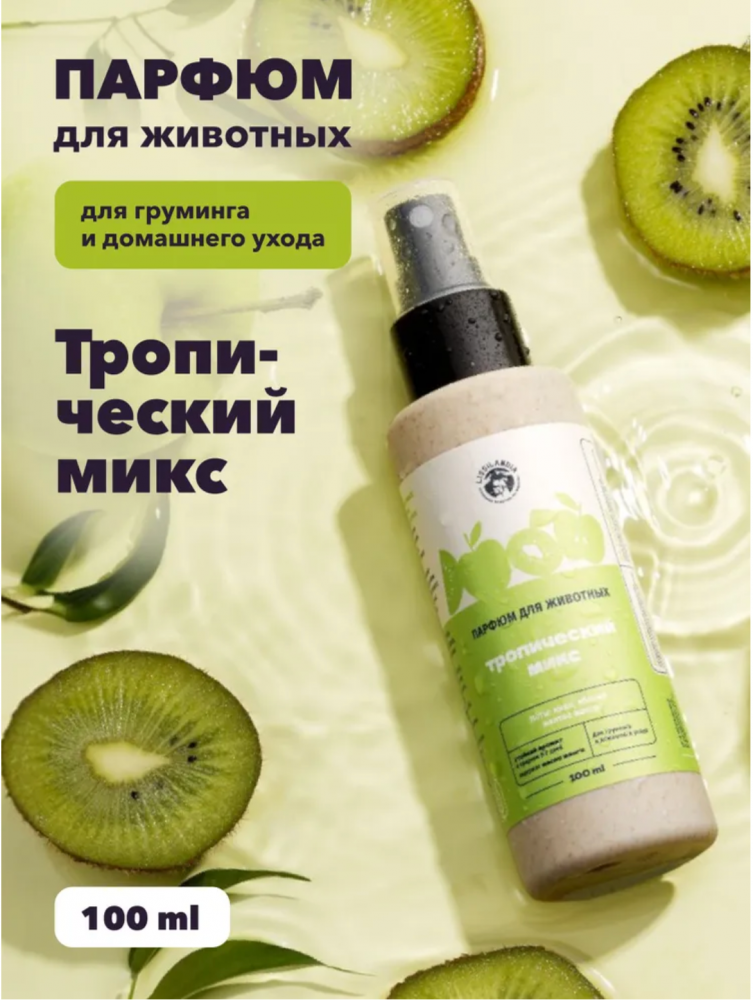 Парфюм для животных с ярким ароматом тропических фруктов создан на основе безопасных компонентов для применения в груминг салонах и дома. Масло киви увлажняет и питает шерсть и кожу.