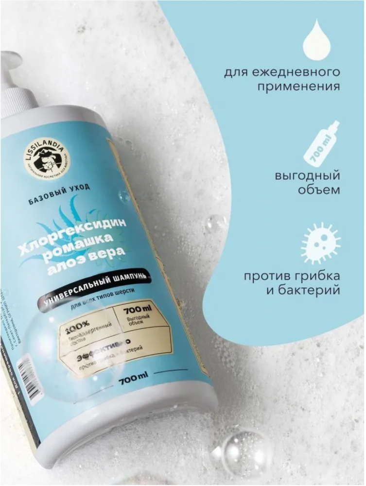 Шампунь Лиссиландия гипоаллергенный с Хлоргексидином, экстрактами ромашки и алоэ вера для собак, кошек и кроликов 700 мл