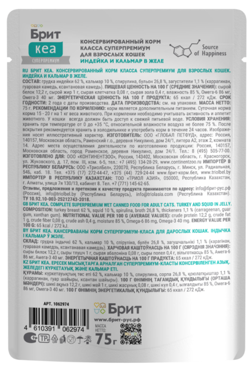 БРИТ КЕА, Пауч для взрослых кошек, Индейка и Кальмар: ЖЕЛЕ 75 г