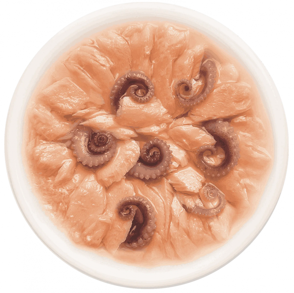 Состав: лосось 54 %, осьминог 6 %, бульон из лосося 38 %, натуральная желирующая добавка.nПищевые добавки: пивные дрожжи (источник пребиотика МОС), пребиотик ФОС, рыбий жир (анчоус), витамин Е, таурин, минералы.nПищевая ценность, %: протеин — 8,5, жиры — 2,5, клетчатка — 1, зола — 1,5, влажность — 89; энергетическая ценность — 65 ккал.