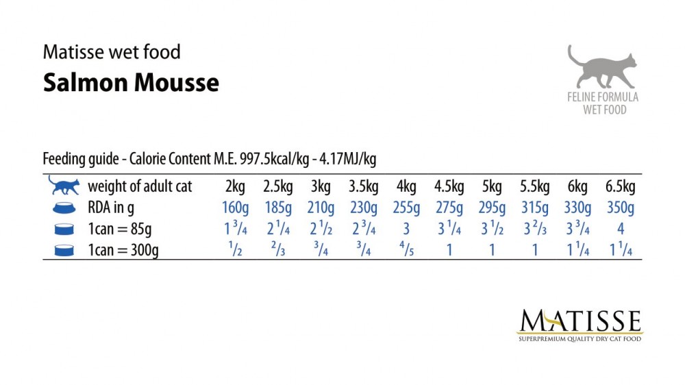 До трех банок в день для взрослых кошек (вес 3-5 кг), порцию рекомендуется разделить на два или более кормлений. Дневная норма может меняться в зависимости от индивидуальных особенностей и требует корректировки для поддержания кошки в оптимальной кондиции. При переводе на Matisse рекомендуется постепенно замещать предыдущий корм на новый. Перед кормлением корм должен быть комнатной температуры. Кошка должна иметь свободный доступ к свежей питьевой воде. Открытую банку хранить в холодильнике не более 48 часов.