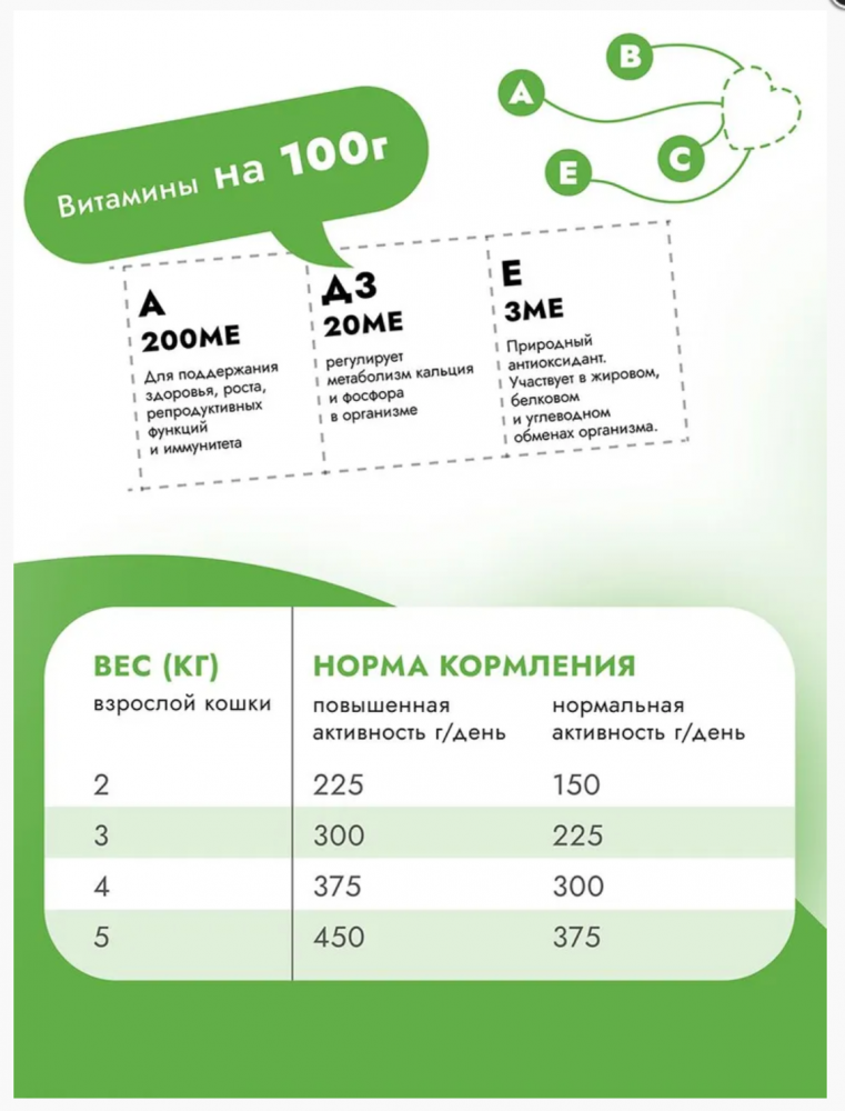 Добавки: витамин А не менее 200 МЕ, витамин Д3 не менее 20 МЕ, витамин Е не менее 3 МЕ.