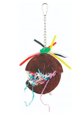 Игрушка из двух половинок кокоса, наполненная полосками цветной бумаги. Игрушка для птиц разного исполнения которые с легкостью заинтересуют Вашу птичку. Крепится яркая игрушка на надежный карабин. Игрушка из двух половин кокоса, наполненная полосками цветной бумаги.