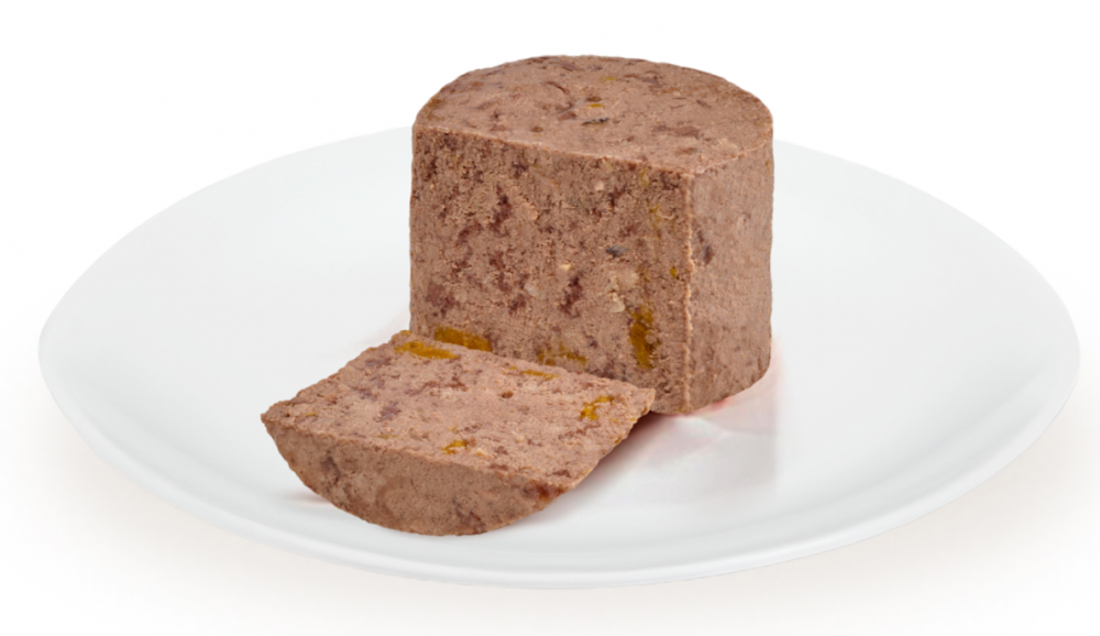 Состав: мясо и субпродукты 62% (курица 15%, кролик 15%), морковь 2%, томаты 2%, тыква 2%, паприка 2%, витамины, минеральные вещества, свекловичная клетчатка, льняное масло 0,1%.