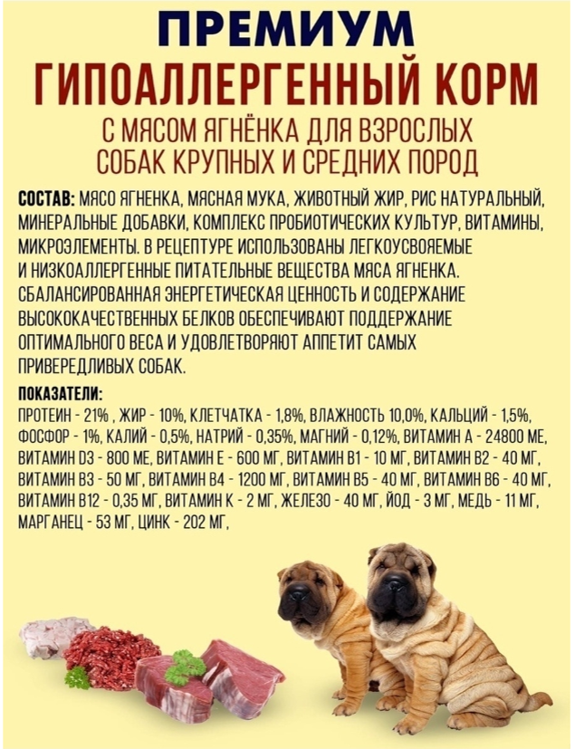 Состав:nмясо ягненка (25%), мясная мука (10%), животный жир, рис натуральный, минеральные добавки, комплекс пробиотических культур, витамины, микроэлементы.