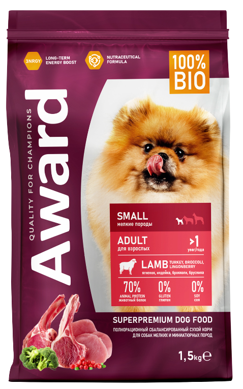 Сухой корм AWARD для взрослых собак мелких и миниатюрных пород с ягненком и индейкой с добавлением брокколи и брусники