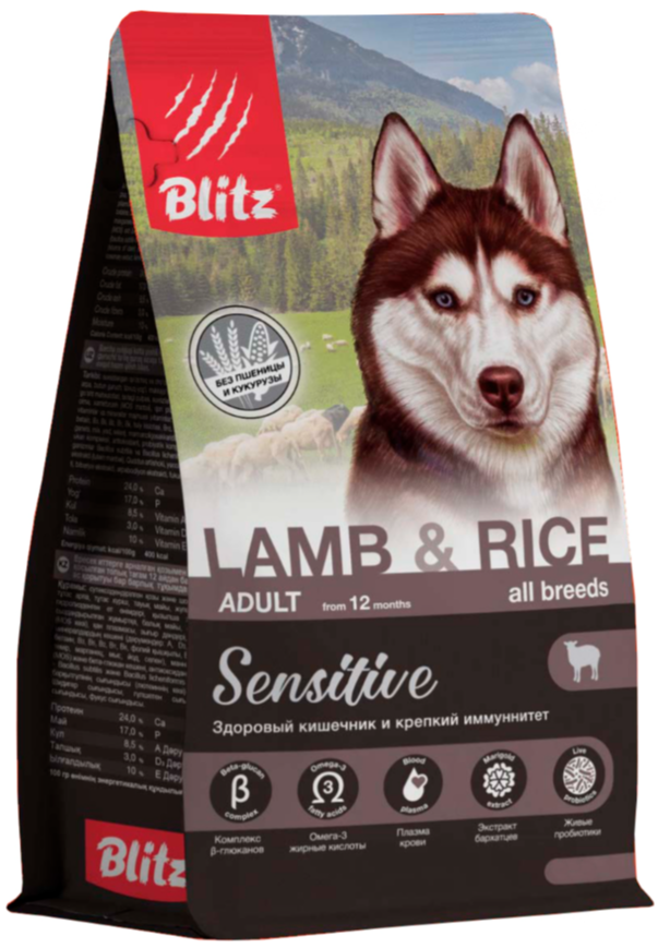 тракта, снижая риск нежелательных реакций. В линии кормов Blitz Sensitive вы можете подобрать корм для собак любого возраста или породы, будь то быстро растущие малыши или взрослые животные. Также линейка включает и специальный продукт для собак мелких пород с уменьшенным размером гранул.