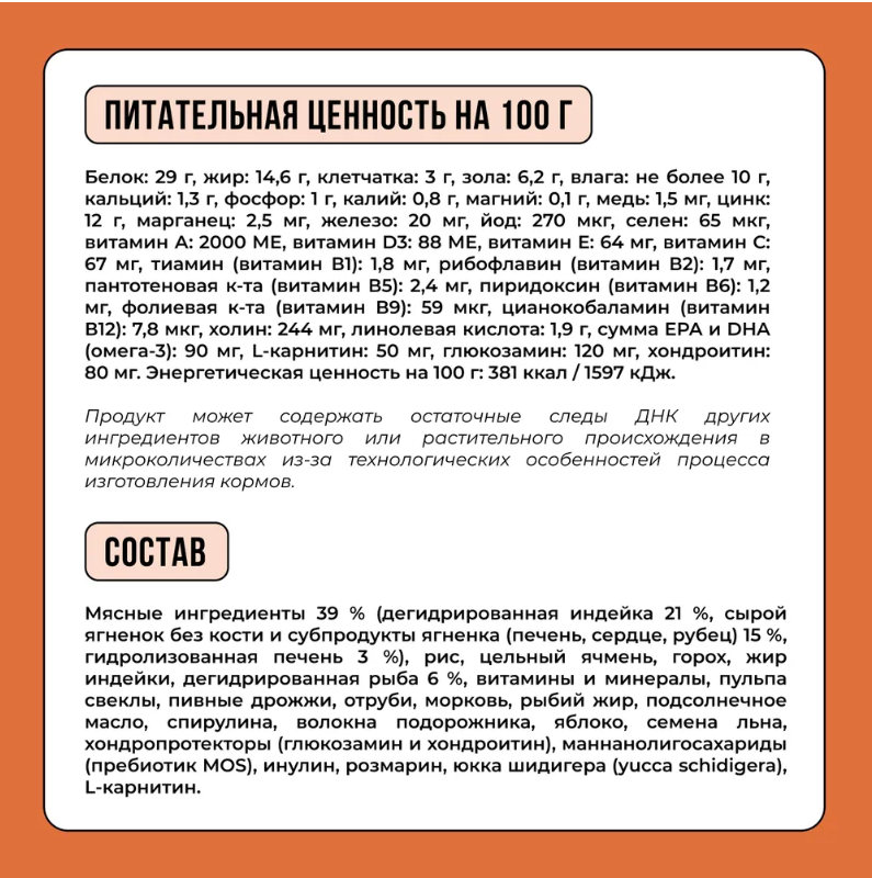 СоставnМясные ингредиенты 39 % (дегидрированная индейка 21 %, сырой ягненок без кости и субпродукты ягненка (печень, сердце, рубец) 15 %, гидролизованная печень 3 %), рис, цельный ячмень, горох, жир индейки, дегидрированная рыба 6 %, витамины и минералы, пульпа свеклы, пивные дрожжи, отруби, морковь, рыбий жир, подсолнечное масло, спирулина, волокна подорожника, яблоко, семена льна, хондропротекторы (глюкозамин и хондроитин), маннанолигосахариды (пребиотик MOS), инулин, розмарин, юкка шидигера (yucca schidigera), L-карнитин.