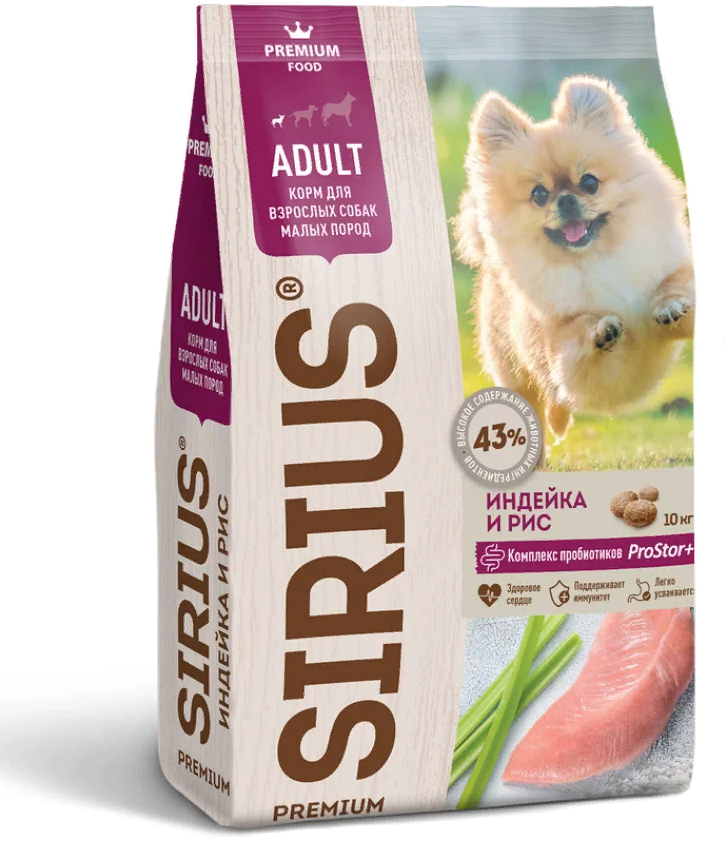 SIRIUS - сухой корм премиум класса для полноценного ежедневного рациона взрослых собак малых пород. Высокое содержание мясных ингредиентов обеспечивает оптимальный уровень белка и укрепляет мышцы. Баланс витаминов и комплекса пробиотиков 4-го поколения PROSTOR+ нормализует пищеварение и укрепляет иммунитет. Омега 3 и Омега 6 способствуют поддержанию здоровья сердца, мозга, нервной системы, здоровья кожи и красоты шерсти.